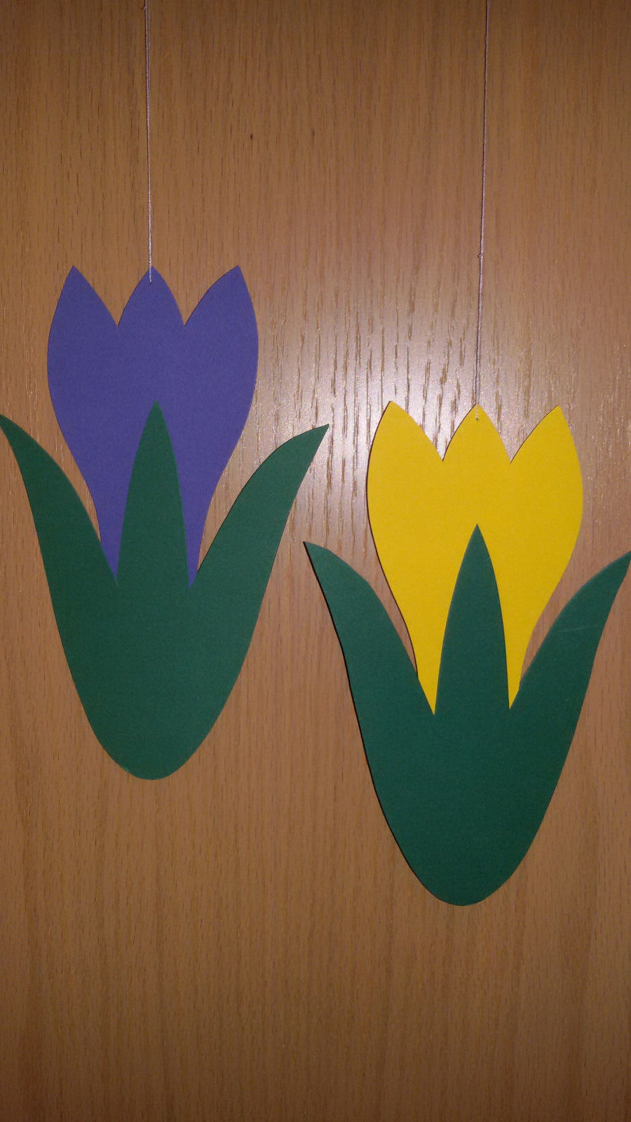 Model de decoratiune de primavara si Paste, pentru pavoazarea salii de clasa. Decoratiunile sunt lucrate manual din carton